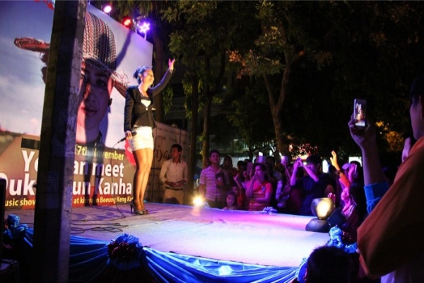 またいつもの喧嘩か……と思って近づくと、カンボジアの歌姫と呼ばれるソクンカンニャーさんの顔がでかでか描かれた特大バナーが! 新規オープンのプロモーションで彼女を招き、一夜限りのサプライズイベントが催されたようです。