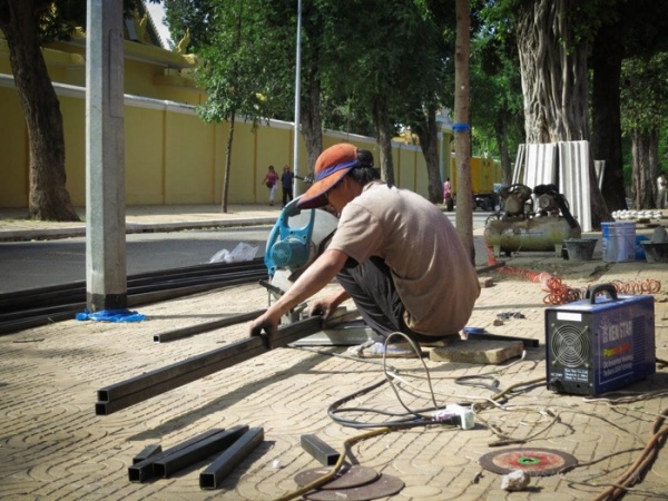 カンボジアの建築現場を見慣れた私には信じられないことに、私語もなく黙々と作業に没頭しています。まるでクマエじゃないみたい……。