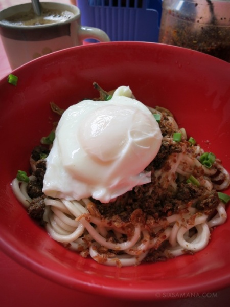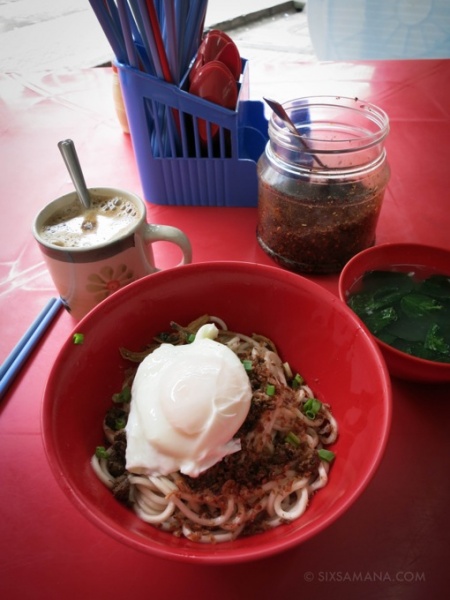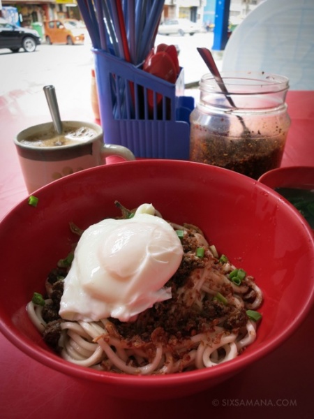 メニューは看板通りの辣椒板麺のみ。ドライとスープの二種類ありますが、ここはドライを選ぶべきでしょう。値段は5リンギット(1リンギット=28円)。ドライの場合はスープ付きです。おまけのスープはびっくりする程まずいので残しましょう。
