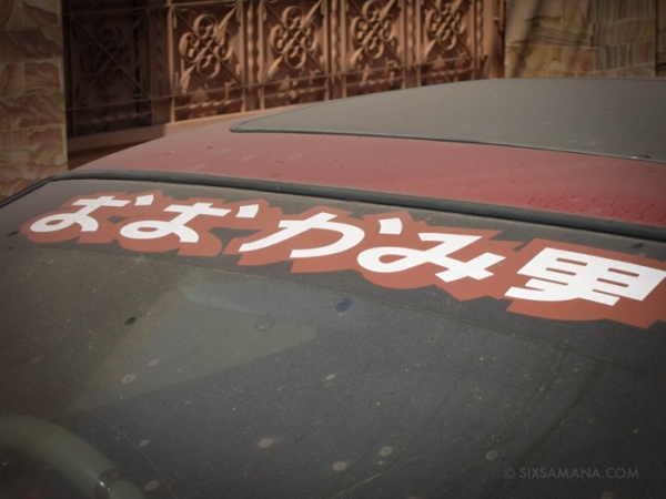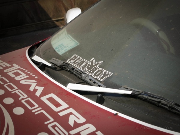 フロントは科学忍者隊といった雰囲気。フロントガラスの下の方にちょこんと見えるプレイボーイのステッカーも痛いですが、そんなことより、上面にドバーン!と貼られた「おおかみ男」という特大ステッカーが、今日あった嫌なこと全てを忘れさせてくれます。