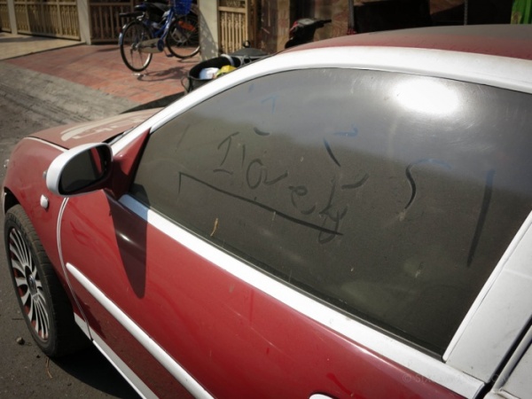 運転席側のウィンドゥには埃が積もって、指で「I love 〜判別不可能」とイタズラ書きされちゃってます。
