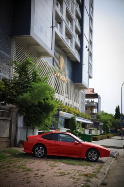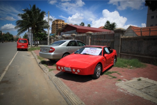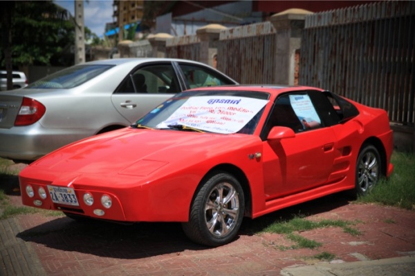 まずは、トゥールコックの某高級マンション前に駐車中の赤い車。200メートル離れた場所から眺めた一瞬、ほんの一瞬フェラーリかと思いましたが、近づくと何か変な車でした。フロントガラスの上には「売ります」の広告。売ってるのか……。もう半年以上売れてないようですが。