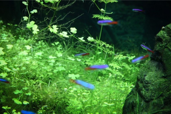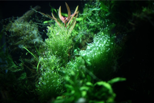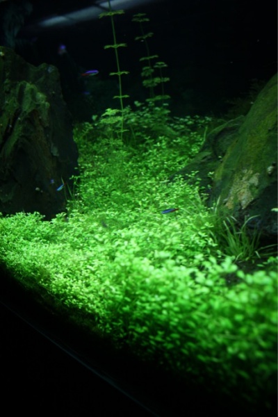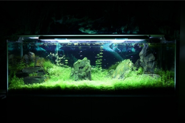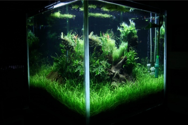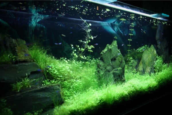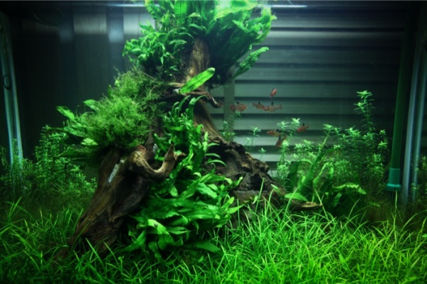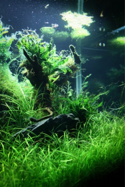 水槽デザインは、原色のミニ水車やプラスチックの水草でデハデハに彩られたカンボジア風ではなく、「禅アクアリウム」と呼ばれる侘び寂びの漂う渋デザイン。大自然を感じます。