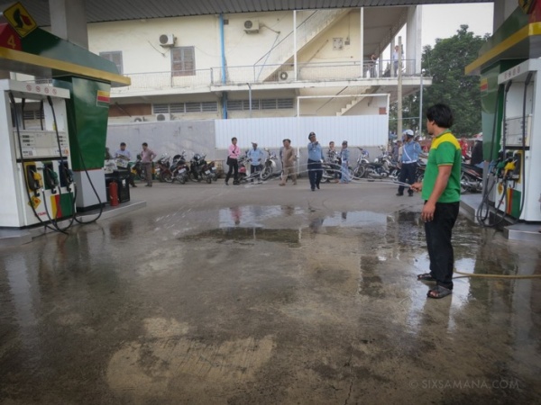 火元の隣は巨大レストランの厨房、斜め向かいはガソリンスタンドと、まさに映画さながらの絶体絶命シチュエーション。ガソリンスタンドでは消火器を並べ、地面には水を撒き撒き必死です。