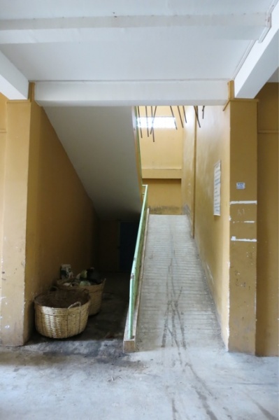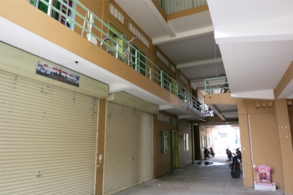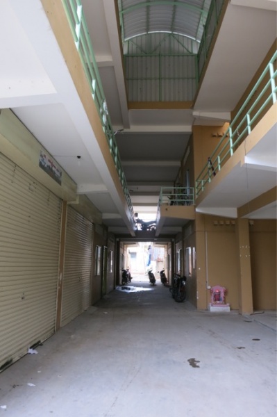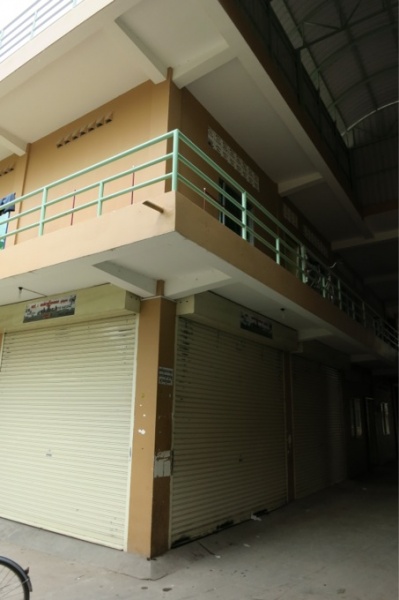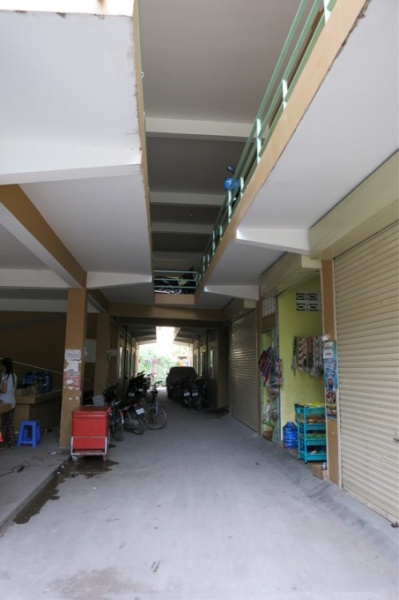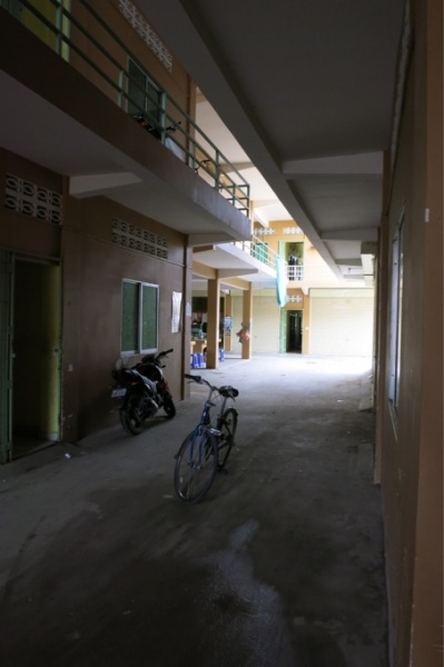 まだ真新しい建物は、1階が商店スペース、2階はアパート。平日昼間なので人気はまばらでした。階段のほかに自転車・バイク用のスロープもついていて、カンボジアの物件にしては良く考えられています。