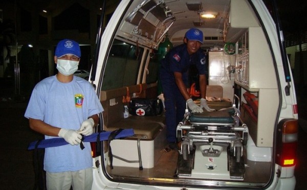 午後7時半頃、事故発生の報告を受け、シハヌークビル州コンポンセイラ郡のジャングルにある「グラフィス診療所」(CDEP&SBSI)から救急車が出動。診療所から8キロの事故現場から、骨折した重傷男性を100キロ以上離れた国立病院へ搬送。この救急車、実は日本から寄贈されたものです。