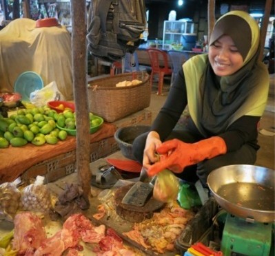 問題の市場は本当のド・ローカル専用という感じでした。イスラム専用というわけでもなく、普通のおばちゃんが肉や魚を売っています。と、そんな中に約二名、頭にスカーフを巻いた女性が!