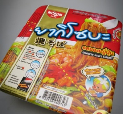 日清食品(タイ)の焼きそば。出前一丁マークと “Japanese Sauce Flavour” の文字につられ衝動買い。お値段70セント。大きさはほぼ手のひらサイズと小ぶりです。