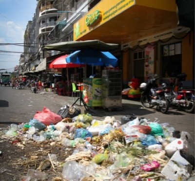 プノンペンで最も人口密度の高いエリア・オルセーマーケットの北側に、問題の店はあります……。目印? そうね、店のすぐ横がゴミ捨て場です! はい。横がゴミ捨て場です! もう一回言いましょうか?