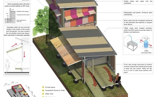 加えて、洪水に対応する高床式プラン、雨水集積システム、天然素材を利用した可動式壁、雨戸を利用した天日干しスペースなど、実用的アイディアが盛り込まれています。