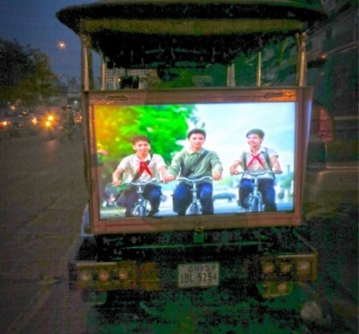 何か違和感を感じ近寄ってみると、本来、背面広告の看板がついている筈の場所に巨大薄型テレビが設置されていました。いつかは現れると思ったビデオトゥクトゥク。ついにこの目で拝むことができて光栄の極み。