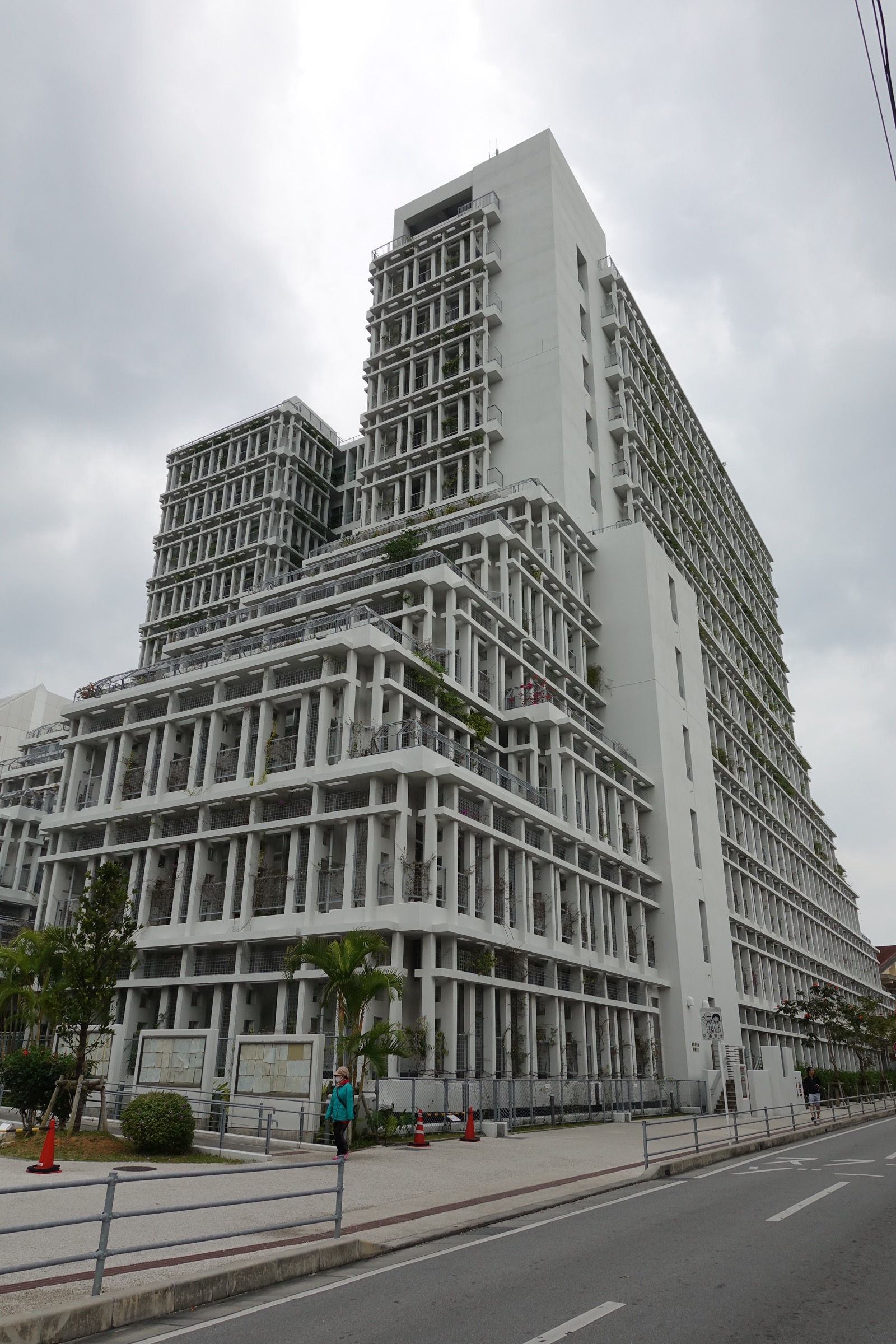 2012年末に完成したばかりの、知る人ぞ知る沖縄名物・那覇市役所。網の目のように組み合わさった白い柱が特徴的な庁舎は、下から見上げると周りに高い建物がないせいか、まるで天を突くような、地上12階とは思えない壮大なスケール感が印象的だ。