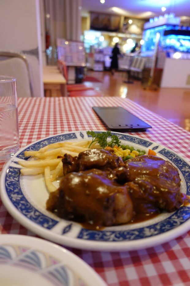 宵っ張りの土地柄らしく、レストランは24時間営業、ディナータイムは地元の家族連れで海側の席はほぼ満席となる。店のジュークボックスはしっかりと稼働中。クイーンにABBA、そして庄野真代。節操のないレパートリーに驚愕していると、目の覚めるようなギンガムチェックのテーブルクロスに、注文した牛テール肉の煮込み料理がストンと置かれた。肉はトロトロ、名物のスープはこれだけで満足できそうなほど濃厚だった。