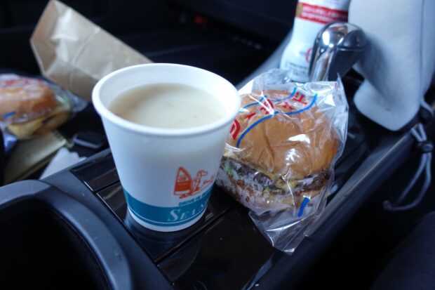 こちらはハンバーガーやサンドイッチ、ポテトなどの持ち帰りメニュー専門。後で小腹が空いたときのため、ハンバーガーとスープを買うと、ビニールに包まれたハンバーガーは湿気でバンズがフニャフニャ。昔、母親が自販機で買ってくれたハンバーガーを思い出し、胸の奥が熱くなった。